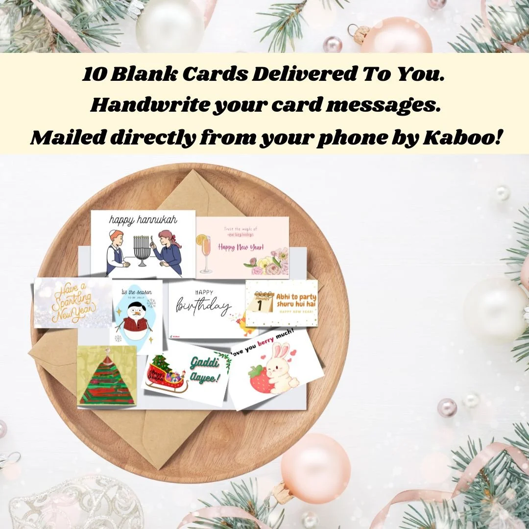 Categories: All Happy New Year Christmas Indian Festivals Greeting Card Bundles All / 10-card "Holiday" Card Bundle Sale Price: $45.00 Original Price: $70.00 Sale or… send a DIGITAL-To-PHYSICAL card right away using the kaboo app Use Our app to send a card